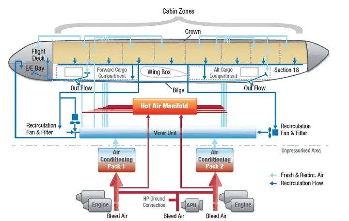 엔진에서 들어오는 아주 고열의 압축 공기 + 비행기 밖의 영하 4-50도의 공기를 섞어서